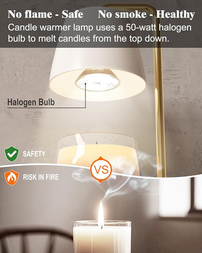 - 【Safety and Environmentally Friendly】: The electric candle warmer lamp operates with a 50-watt halogen bulb (two bulbs included) that gently melts the candle from the top down, effectively releasing its fragrance without the need for an open flame. This safe and healthy approach eliminates fire hazards and prevents the release of harmful pollutants into the air, providing a safer alternative to traditional candle burning.
