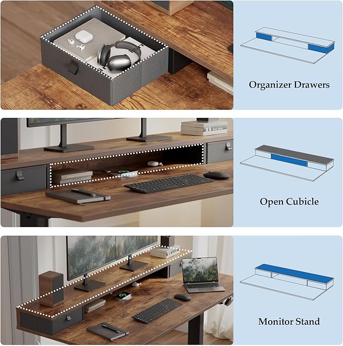 - [Stay Organized, Stay Focused] Large desktop offers ample room for monitors, laptops, and accessories. Two fabric drawers help organize your essentials, keeping your workspace clean and clutter-free.