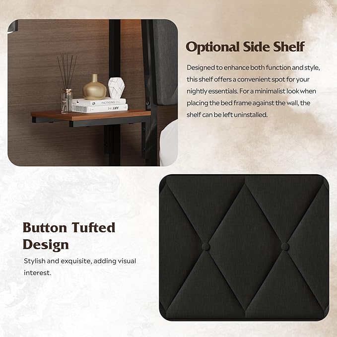- 【Optional Side Shelf】 Designed to enhance both function and style, this shelf offers a convenient spot for your nightly essentials. For a minimalist look when placing the bed frame against the wall, the shelf can be left uninstalled.