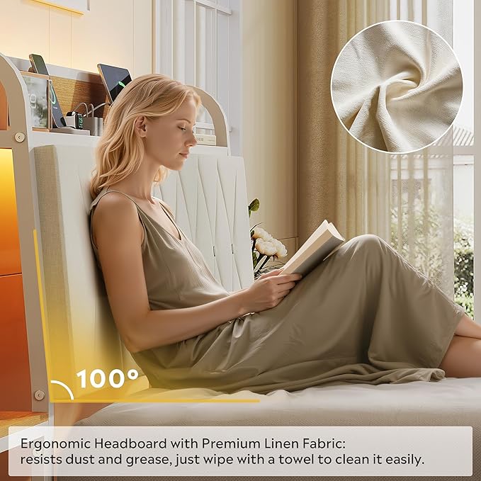 - 【Multi-Function RGB LED Light】 An integrated LED light strip on the headboard storage shelf offers multiple lighting modes and adjustable brightness, easily controlled via remote or mobile app, creating a warm and cozy bedroom atmosphere while doubling as a night light.
