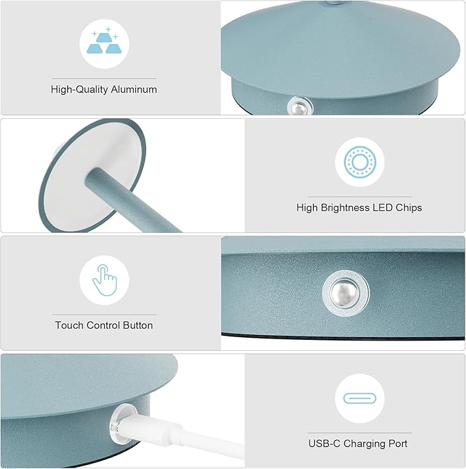 - High-Quality Materials: The lamp body of the battery table lamp is made of die-casting aluminum material, with frosted baking paint process on the surface, IP54 waterproof level, anti-corrosion and anti-rust, not easy to fade, and non-slip rubber design on the bottom. Built-in high brightness energy-saving LED lamp beads, CRI 85+,soft light is not harsh.