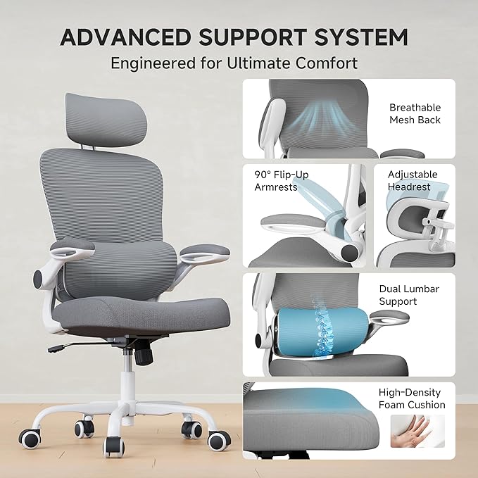 Ergonomic Office Chair with Adjustable Lumbar Support & Headrest, 330 LBS High Back Mesh Chair with Flip-up Armrests for Long Hours, Home Office Desk Chair, White and Gray