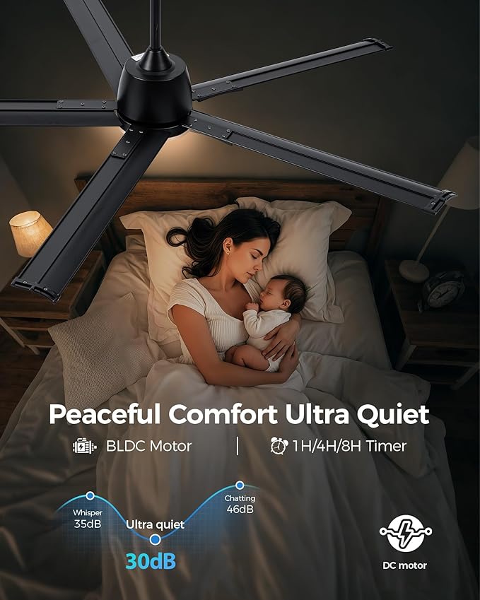 - Reversible DC Motor:62 inch industrial ceiling fan is powered by a brushless DC motor that combines strong airflow with energy efficiency. Operating quietly at 30 dB, it creates a peaceful environment while its reversible function ensures cooling in summer and balanced warmth in winter