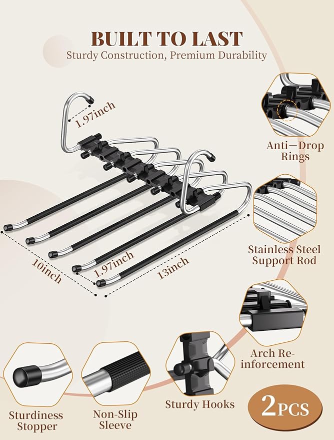 - 【Pants Hangers Space Saving】Maximize Closet Space, Declutter Instantly! Take up 80% less space with our 5-Tier Pants Hangers (Pack of 2). Rack holds up to 5 pairs of jeans, trousers, scarves, or more vertically, keeping your wardrobe incredibly neat, tidy, and organized. Perfect for small closets, apartments, dorms, and maximizing wardrobe!