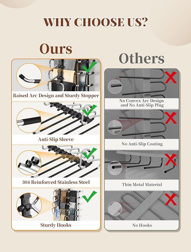 - 【Perfect Space Saver】Free up valuable space & banish clutter! Our 5-tier pants hangers packs 5X more jeans, scarves, or skirts into cramped spaces – perfect for dorms, apartments & tiny closets. Folds flat in seconds for travel/storage. Transform chaos into a clutter-free haven instantly!