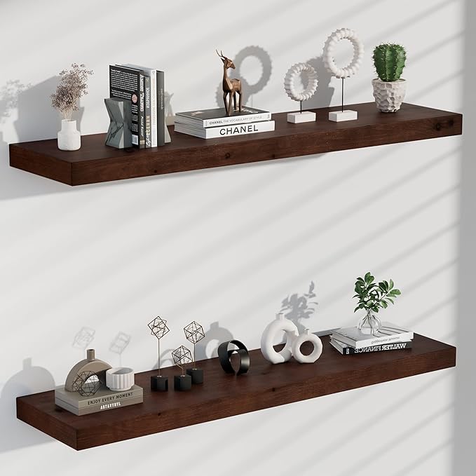 foxsky 36 Inch Solid Pine Wood Floating Shelves for Wall with Hidden Brackets, Rustic Farmhouse Wall Mounted Shelf for Bathroom, Living Room, Bedroom, Kitchen, Office Decor (Walnut)