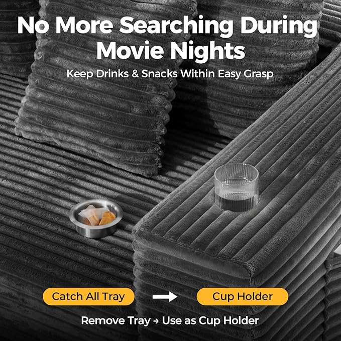 - [4 Storage Pockets & 1 Removable Catch All Tray]:The main seat's armrest features a versatile removable tray or storing small items like earrings and car keys. When the multi-function tray is removed, the interior sofa cover doubles as a cup holder for drinks.Plus, enjoy four built-in fabric pockets (two on each side) designed to hold books, magazines, or tablets - keeping your living space neat and everything within easy reach.