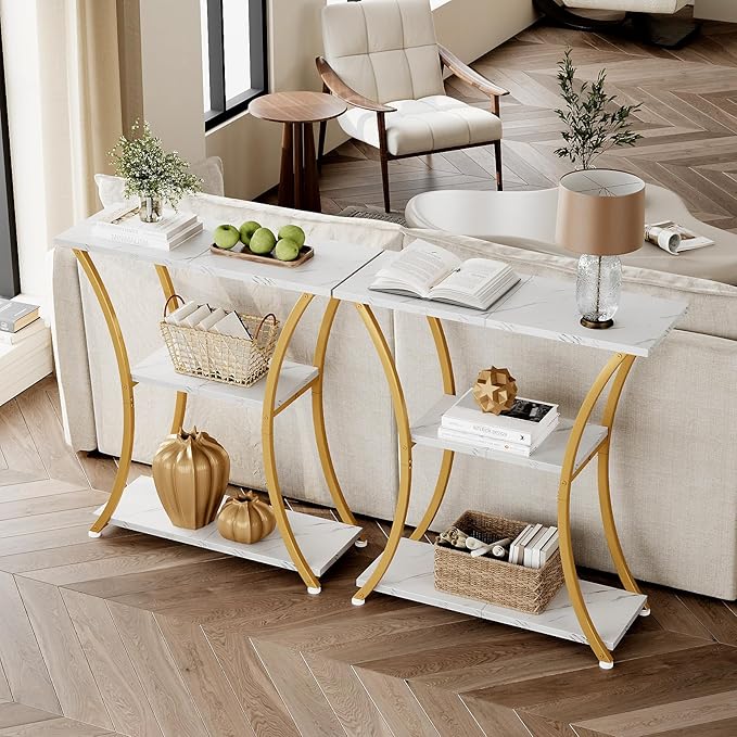 Rustic 3-Tier Console Table with Open Shelves Narrow Entryway Table with Curved Metal Frame Slim Sofa Table for Hallway Living Room or Foyer (Gold White Marbled)