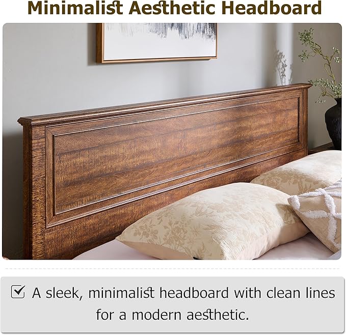 - Queen Size Bed Frame: Its Antique White finish gives it a weathered, vintage charm that's both sophisticated and inviting. The headboard is a beautiful focal point, featuring a clean lines and a minimalist design that complements the bed's overall aesthetic. Both stylish and supportive, making it perfect for lounging or propping yourself up while reading a book or watching TV.