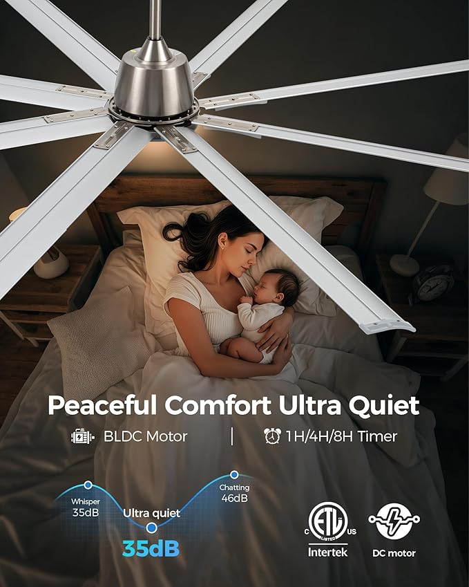 - High CFM Ceiling Fan:Our 72 inch industrial ceiling fan is equipped with a self-developed brushless DC motor.At the highest setting,it reaches 9496.05 CFM,while the DOE certified airflow is 6859 CFM,delivering strong circulation with stable efficiency.The motor operates quietly at 35 dB and supports reversible airflow,providing comfort in both summer and winter