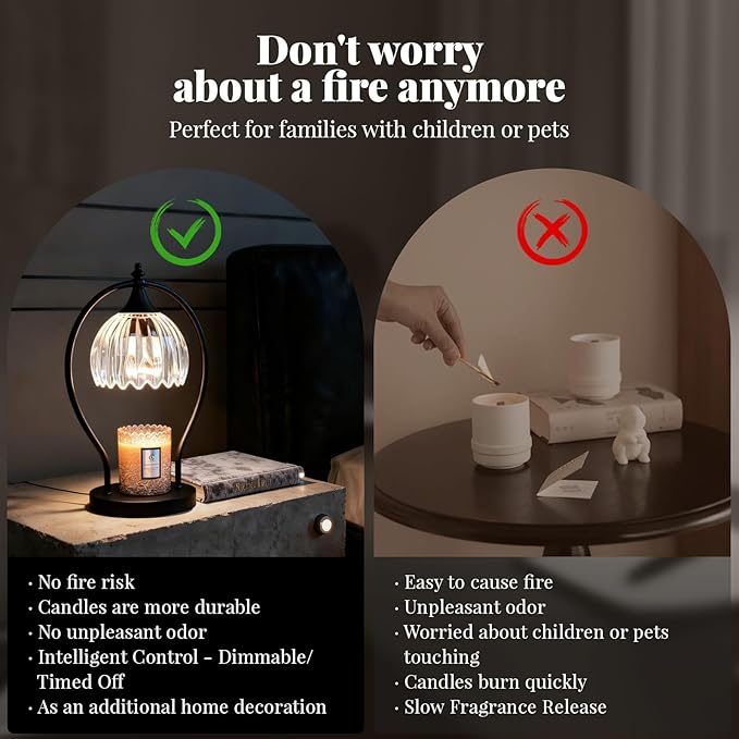 - Flameless Safety Design: Experience peace of mind with the our timer candle warmer lamp, featuring a 50-watt halogen bulb (included) that melts candles without an open flame, smoke, or soot. This ensures your precious candles, such as those with sentimental value, are preserved longer. Ideal for homes with children or pets, this candle warmer offers a safer, cleaner, and more efficient alternative to traditional candle burning
