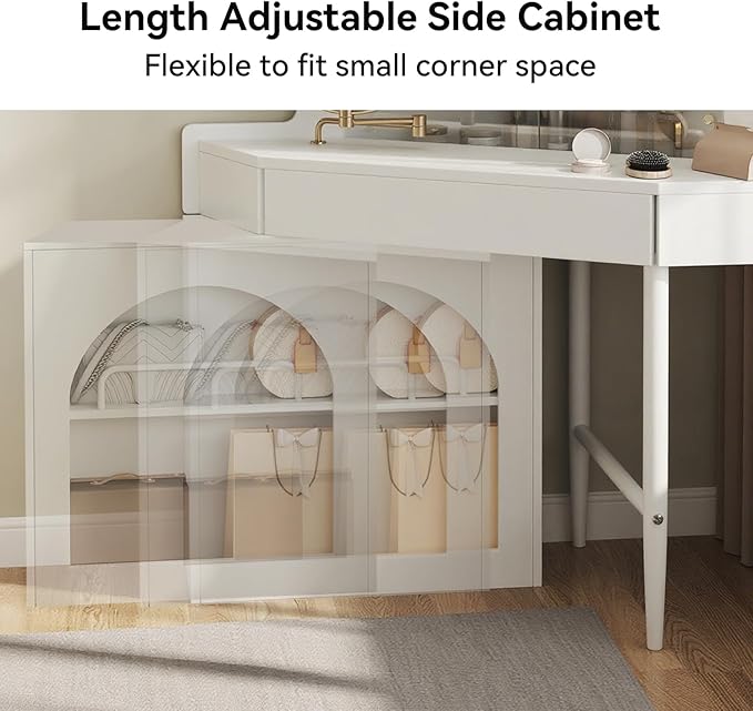 - Space-Saving Corner Design: Perfectly designed to fit snugly into the corner of your bedroom or bathroom, this vanity makes the most of small spaces. Its compact footprint saves valuable room area without compromising functionality.