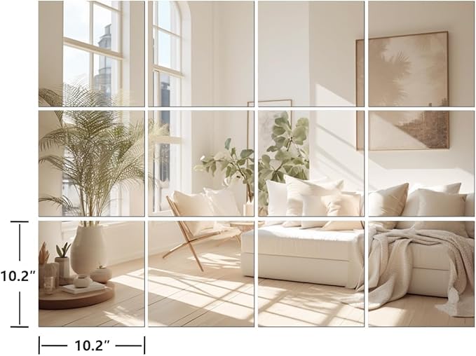 - DIY INSTALLATION - Size: 10.2'' x 10.2''. Quantity: 4PCS. There are 8 pieces of mirrors in total, and you can arrange the positions according to your taste. It is a good choice as a full length mirror or as wall mirrors decorative.