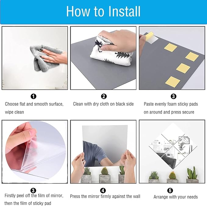 - WARM TIPS - Please make sure the installation place is flat, smooth and clean, and use no-nail adhesive to apply on the reverse side of the mirror or the place where you need to install it, so that the mirror stickers can be firmly installed, and ensure clear reflection and no deformation.