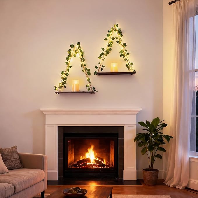 - Durable and Eco-Friendly Materials: Crafted from high-quality renewable wood, each floating shelf features a unique wood grain, ensuring no two are exactly alike. The LED String lights and artificial greenery are energy-efficient, making these shelves an eco-friendly choice for your home. Sturdy and built to last, these decor shelves combine beauty with reliability, offering a practical storage solution that aligns with your sustainable lifestyle.