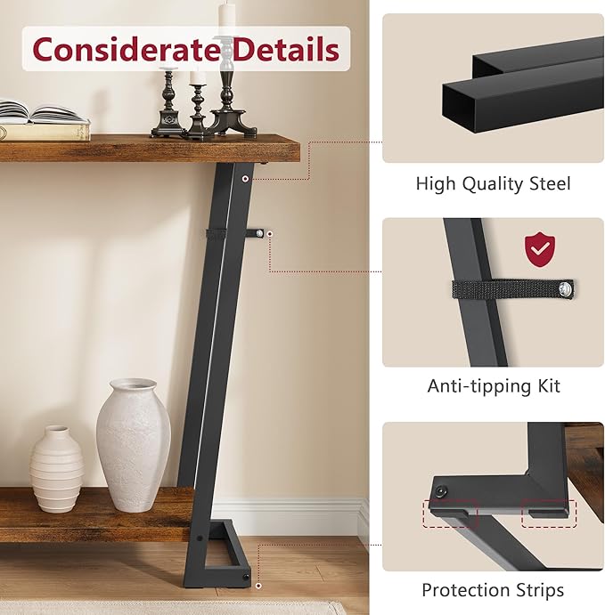 - 【2 Tier Storage Space】With 2 open storage shelves, it greatly enhances the practicality of the entraway table with storage. Easily store books, boxes, shoes, alarm clocks and other daily necessities,this industrial console table can transforming your life area into a clutter-free zone that reflects an organized lifestyle.