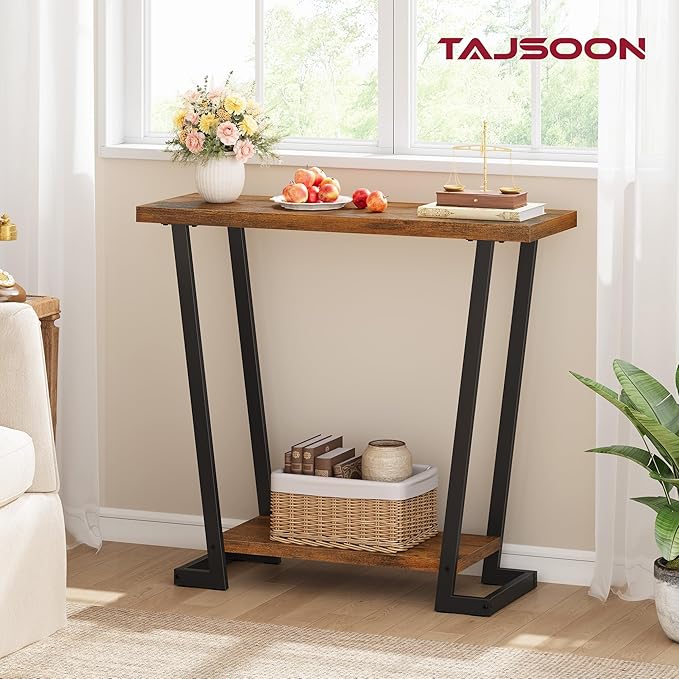 Tajsoon 2 Tier Narrow Console Table Rustic, 31.5'' Industrail Entryway Table with Storage, Thin Sofa Table with Gemometric Frame for Hallway, Living Room, Foyer, Entrance, Rustic Brown