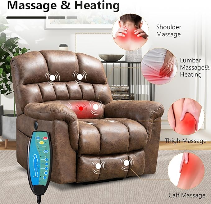 - Full-Body Massage & Lumbar Heat: Enjoy a relaxing experience with 8 powerful massage points and 5 customizable massage modes. Each massage node of this electric lift reclienr can be activated independently, and you can set timers for 15, 30, or 60 minutes. Two heating zones at the lower back promote blood circulation and soothe tired muscles.