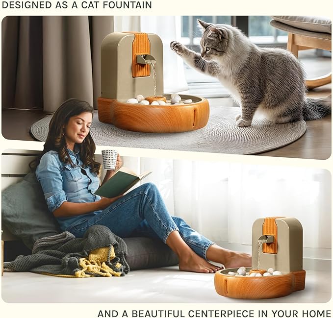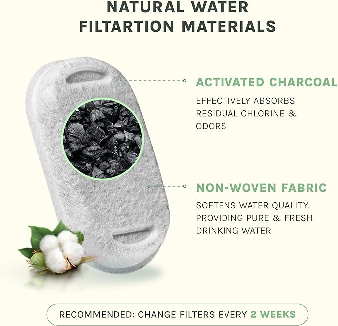- Eco-Friendly & Safe – Made from Sustainable Wheat-Based Bioplastic Crafted from durable wheat-based bioplastic, this cat water fountain is non-toxic, sustainable, and safe for your furry friends. Its minimalist design avoids metal and stainless steel, offering a clean, natural aesthetic.