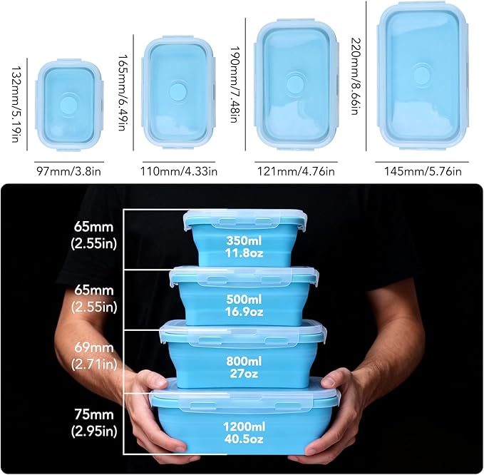 - 【4-Piece Set with Multiple Sizes】 This set includes 4Pcs blue round collapsible food storage containers (11.8oz(350ml), 16.9oz(500ml), 27oz(800ml), and 40.6oz(1200ml)). They perfectly suit a variety of food storage needs, from snacks and salads to fruits and full meals, making them ideal for fridge organization, lunch prep, and family outings.