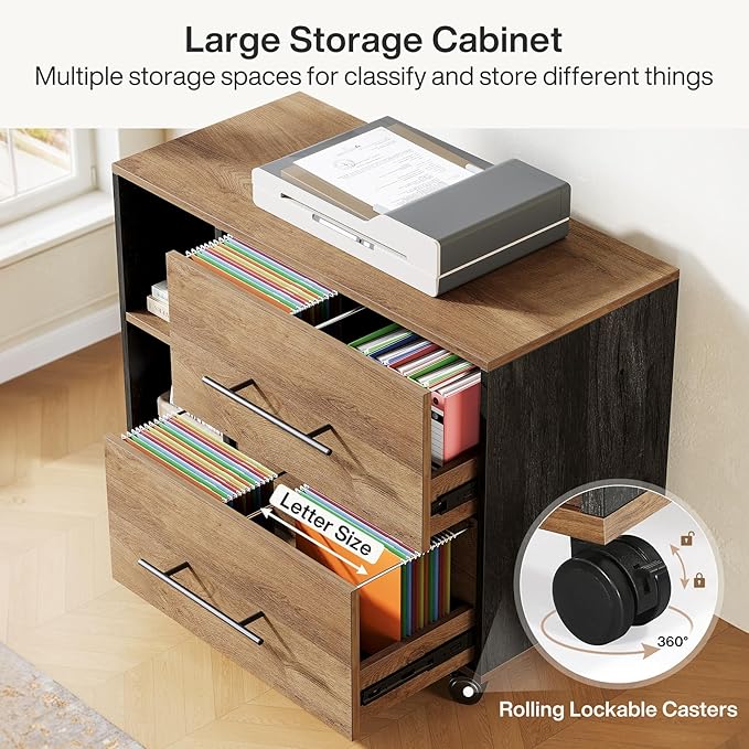 - Mobile File Cabinet: This 41.9" W lateral filing cabinet hosts 2 drawers for letter-sized documents, plus 2 open shelves for extra office needs. It's equipped with 4 lockable, 360° swivel wheels, providing easy maneuverability and secure positioning