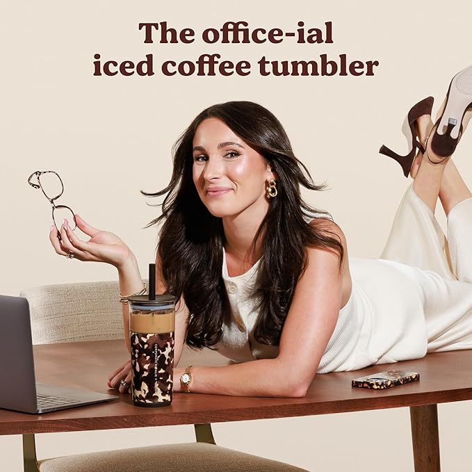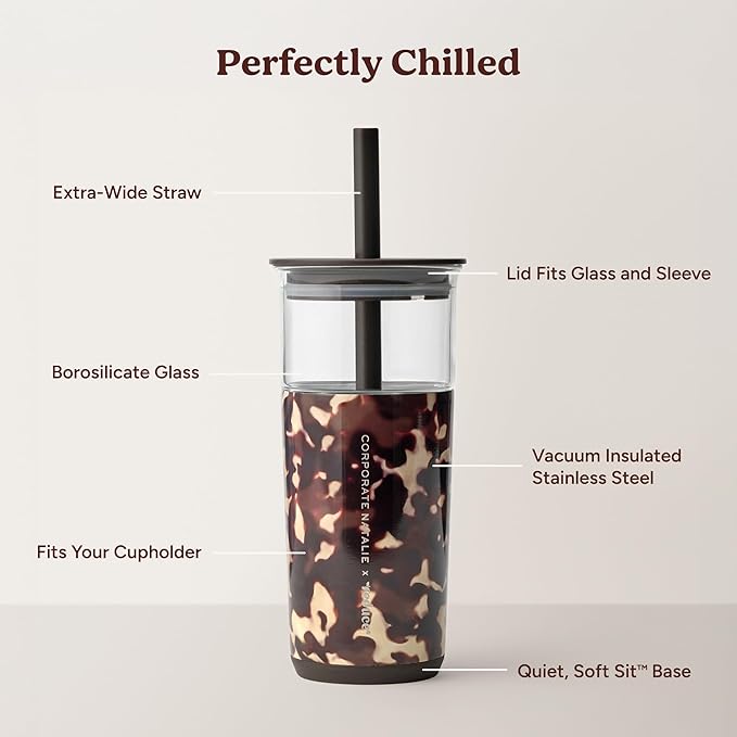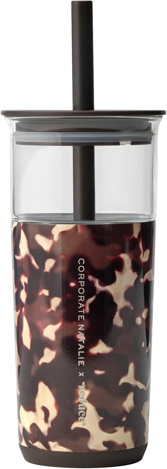 REDUCE Aspen 20 oz Vacuum Insulated Glass Tumbler with Lid & Extra Wide Straw - Keeps Drinks Cold for 12 Hrs - Ideal for Iced Coffee, Smoothies & Boba - Dishwasher Safe, Soft Base - Blonde Tortoise