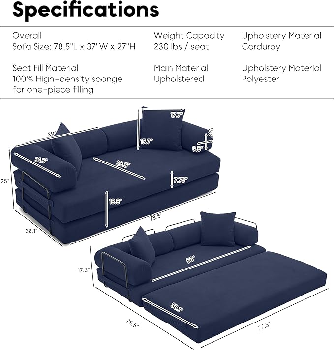 - Dual-Function Versatility: Sofa to Sofacama in Seconds: Transition effortlessly from a 78.5"L x 37"W x 27"H elegant sofa for movie nights to a spacious 78.5"L x 74"W x 8.25"H convertible couch bed/sofacama for guests. Space-smart design maximizes small areas while delivering hotel-grade comfort.