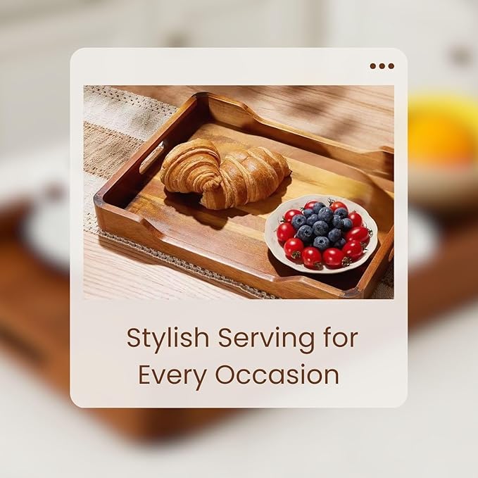 - Serve with Style: You can use wooden trays for decor whether you're presenting a hearty meal on the dining table, offering snacks on the coffee table tray, enjoying a leisurely Sunday breakfast tray in bed, or unwinding in the bathtub after a busy day, the acacia wood serving tray is your elegant companion. Decorative trays for coffee table. Measuring 18 in × 13 in × 2.5 in, it’s thoughtfully sized to elevate any moment—from casual nibbles to relaxation in style. Serve as decorative trays for home decor. This ottoman tray for living room.