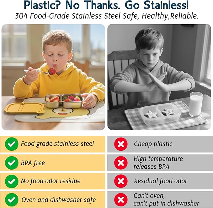 - High-Quality Food-Grade Stainless Steel: Crafted from premium 304 stainless steel, these snack containers measure 7.48 inches x 4.8 inches x 1.6 inches and are both rust-resistant and durable. Unlike plastic containers that may warp or retain odors, our stainless steel lunch box keep food fresh and leak-proof