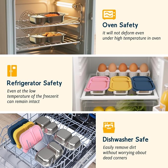 - Stainless Steel Containers with Silicone Lids: Each snack containers with lids comes with a soft, food-grade silicone lid. Unlike plastic, our flexible silicone maintains a perfect airtight seal while being reusable and recyclable—a truly sustainable choice for families who care about quality and environmental protection