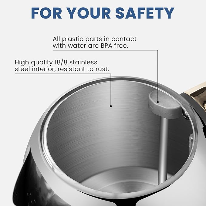 • ECO-FRIENDLY MATERIALS | BUILT TO LAST: The interior of the SUSTEAS electric kettle is made of 18/8 stainless steel (including spout and lid), which greatly improves durability and safety. All plastic components that come into direct contact with water are devoid of BPA, ensuring your safety and reassurance. The exterior surface is treated with electroplating paint, which is wear-resistant and scratch-resistant, making it easy to maintain