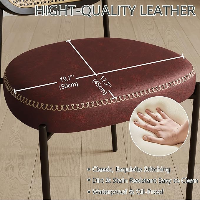 Rattan Dining Chairs Set of 2, Wine Leather Upholstered Dining Chairs with Rattan Cane Back, Mid Century Modern Dining Room Chairs with Black Metal Legs & D-Shaped Thicken Cushion, Wine