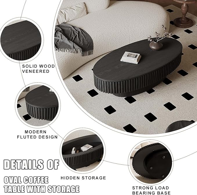 47.2" Oval Coffee Table with Storage, Fluted Coffee Table with Solid Wood Veneered, Mid Century Modern Wooden Center Table, Accent Tea Table for Living Room Apartment, Black