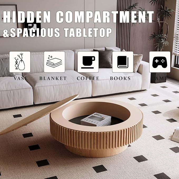 - SPACIOUS HIDDEN STORAGE COMPARTMENT: This round coffee table with storage includes a hollow interior, ideal for organizing magazines, remote controls, or throw blankets. Keep your space tidy while maintaining a sleek, clutter-free look