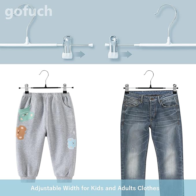 - Adjustable Width & 360° Rotation: These versatile pants hangers feature two fully adjustable clips which can also swivel a full 360 degrees, allowing you to customize the fit for a wide range of clothing—from pants and skirts to hats, ties, and kids' apparel.
