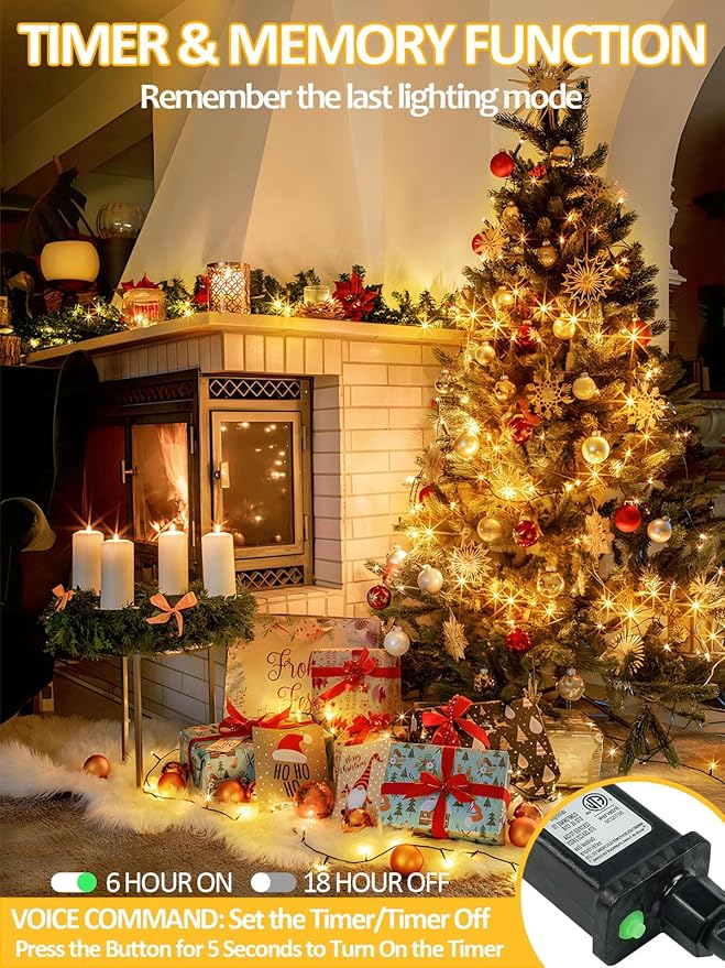 - Timer and Memory Function: Our Christmas Fairy Lights have a timer function, which is perfect for daily use. Long press the plug button for 5 seconds to set the timer or the voice command "Set the timer" (6 hours on, 18 hours off). These Christmas decorative lights also have a memory function with a built-in memory chip that can remember your last lighting mode, no need to reset them every time. Embellish your interior space with our lights and enjoy a romantic ambiance without any worries!