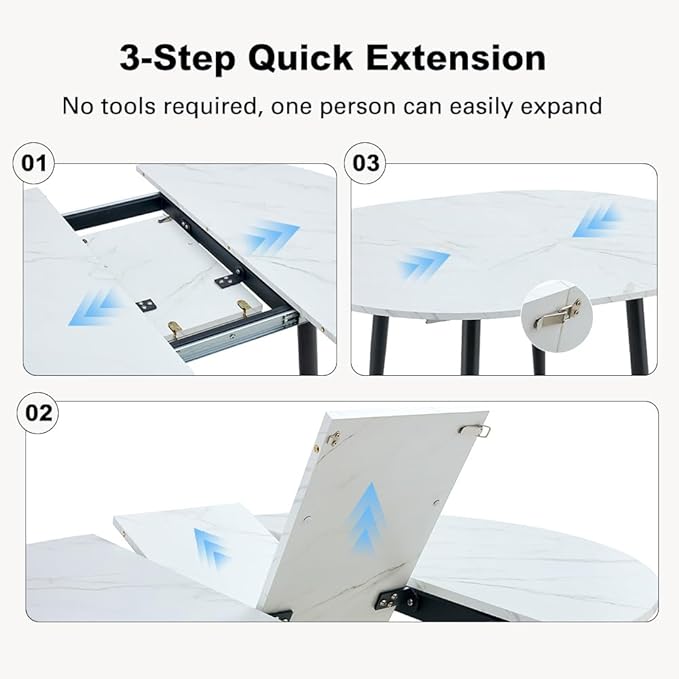 42"-54" Round to Oval Extendable Dining Room Table, White Faux Marble & Wood Grain Top with Black Metal Legs, Modern Round Dining Table for 4–6, Space-Saving Kitchen Table, Easy Assembly
