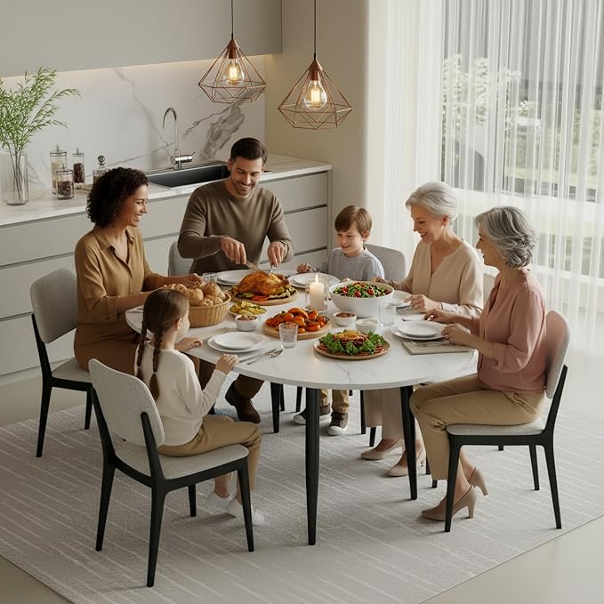- 3. Durable Construction & Metal Base — Built to last, this white marble dining table pairs a reinforced MDF top with a powder-coated black steel base for outstanding stability. The thick 0.73" tabletop resists wear and deformation, while the sturdy metal frame ensures reliable load-bearing performance for years of daily use.