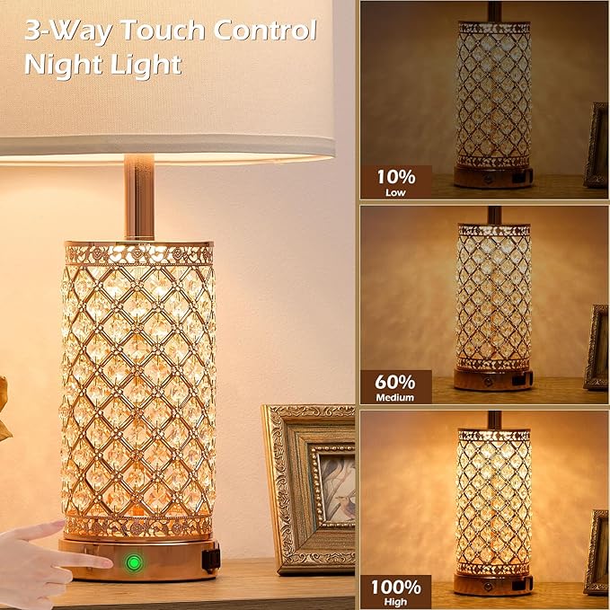 Crystal Table Lamps Modern 3-Way Dimmable Bedside Lamp with 2 USB Ports & AC Outlets for Living Room Bedroom Nightstand Lamp Night Light (Rose Gold-2 Pack 24In)