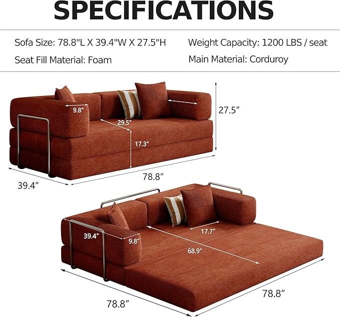 - Premium Cloud Couch Design:Convertible sleeper with Fixed-shape Frame prevents sagging. Support Armrest enhances posture. Ergonomic Design maintains comfort. Thick pillow headrests included.