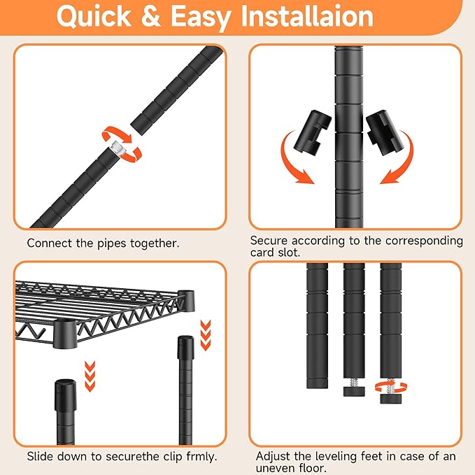 - HEAVY DUTY STORAGE SHELF: Our storage shelf is made of study high-quality carbon steel and metal rods and each shelving unit holds up to 350LBs on leveling feet, with a total bearing capacity of 1400LBs