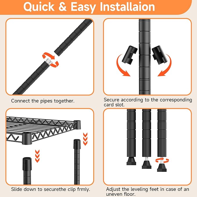 - HEAVY DUTY STORAGE SHELF: Our storage shelf is made of study high-quality carbon steel and metal rods and each shelving unit holds up to 300LBs on leveling feet, with a total bearing capacity of 1200LBs
