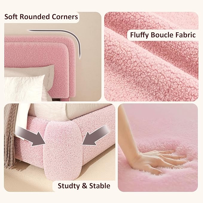 Twin Boucle Platform Bed Frame with Height Adjustable Headboard, Modern Upholstered Cloud Bed, Sleek Curved Design, No Box Spring Needed, Easy Assembly, Noise Free, Pink