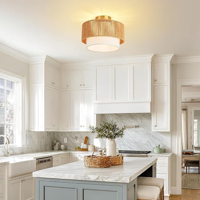 - [Unique Modern Design]:This ceiling light fixture is made rattan drum lampshade,Incorporating vintage modern design styles to give the fixtures a more aesthetic look.suitable for kitchen islands,over sink,dining room,bed room
