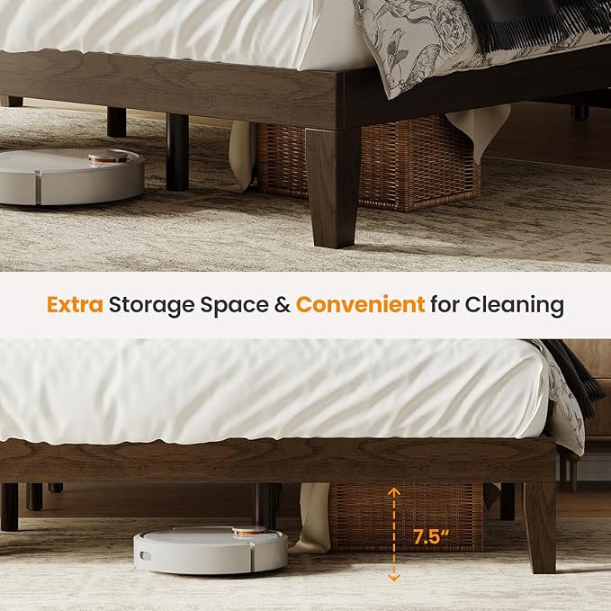- [Spacious Under-Bed Storage] This bed frame provides 7.5 inches of clearance underneath, perfect for storing boxes, clothes, or other items. The raised design makes it easy to clean the floor beneath while keeping your room neat and organized by storing less-used belongings out of sight.