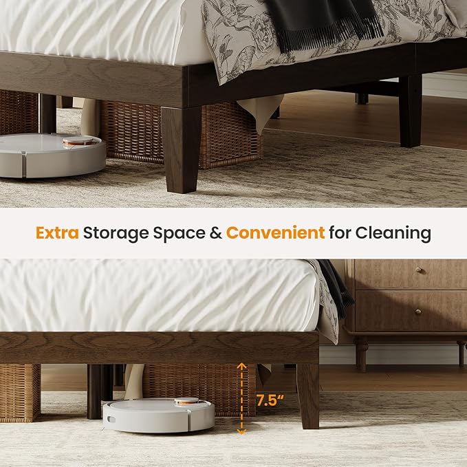 - [Spacious Under-Bed Storage] This bed frame provides 7.5 inches of clearance underneath, perfect for storing boxes, clothes, or other items. The raised design makes it easy to clean the floor beneath while keeping your room neat and organized by storing less-used belongings out of sight.