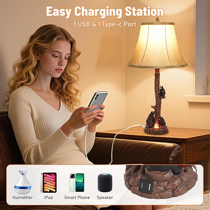 Classic Rustic Table Lamp with Three Black Bears Around Fire Pit - 25.59 Height, 3-Level Dimmable Campfire Light, USB/Type-C Powered, E26 Socket for Bedroom Living Room Decor