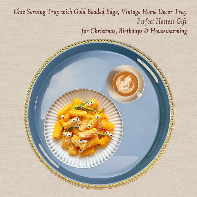 Blue Decorative Tray for Coffee Table, Round Beaded Plastic Serving Tray forKitchen Counter, Ottoman, Living Room,(13")
