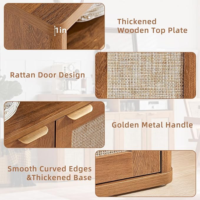 - 【Bohemian Design] Overal】Rattan Buffet Cabinet features four rattan doors and elegant gold metal handles, adding a unique, stylish touch. The spacious countertop can be used as a cooking surface or for storing utensils, keeping your kitchen tidy.Dimensions: 15.4" D x 55.2" W x 31.9" H.