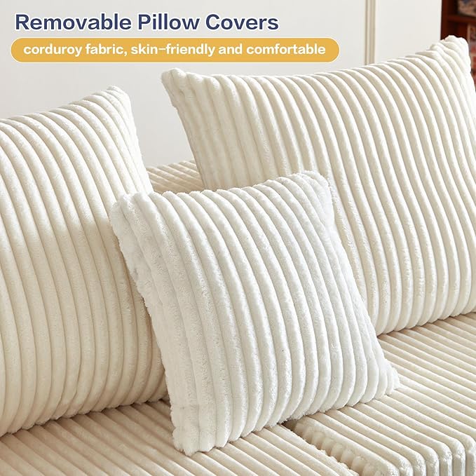- 【Soft Corduroy Comfort — Durable and Inviting】Crafted with premium corduroy fabric, this beige boneless sofa offers a unique blend of softness, breathability, and durability. The ribbed texture feels cozy and inviting, while also resisting wear for long-lasting use. Unlike flat fabrics, corduroy provides a gentle grip that helps cushions stay in place and maintain shape even with daily lounging. Its skin-friendly touch makes it perfect for relaxing, reading, or napping, giving you the comfort of a plush cloud couch with the reliability of a well-made sectional.